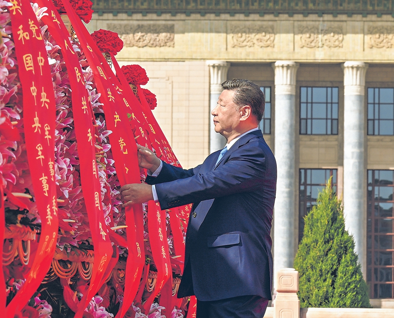 9 - ايدىڭ 30 - كۇنى تۇستەن بۇرىن پارتيا مەن مەملەكەت باسشىلارىنان شي جينپيڭ، لي چياڭ، جاۋ لىجي، ۋاڭ حۋنيڭ، ساي چي، ديڭ شۋەشياڭ، لي شي، حان جىڭ قاتارلىلار بەيجيڭ تيان - انمىن الاڭىنا كەلىپ، قۇربانداردى ەسكە الۋ كۇنى حالىق قاھارماندارىنا گۇل شارباق تارتۋ ەتۋ سالتىنا قاتىناستى. سۋرەتتە: شي جينپيڭ گۇل شارباقتىڭ تورعىن لەنتاسىن رەتتەۋدە.