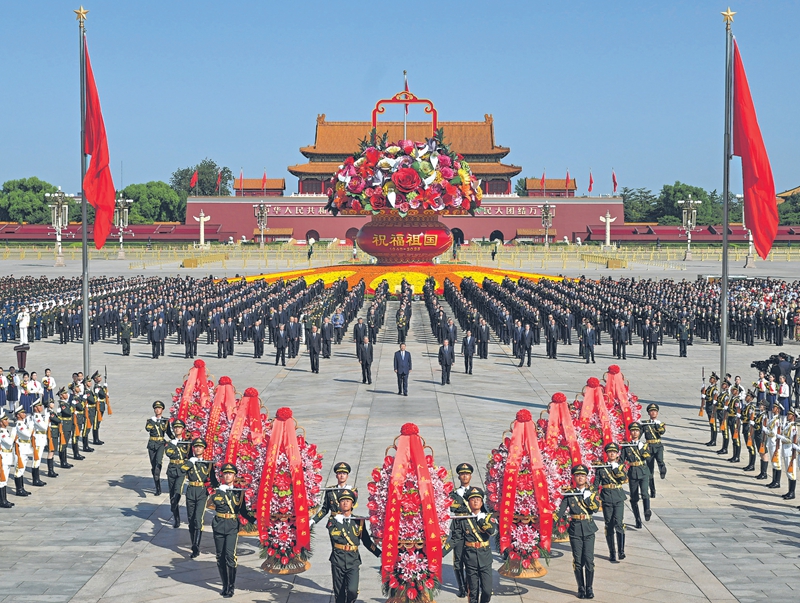 ساعات 10عا تاياعاندا شي جينپيڭ، لي چياڭ، جاۋ لىجي، ۋاڭ حۋنيڭ، ساي چي، ديڭ شۋەشياڭ، لي شي، حان جىڭ قاتارلى پارتيا مەن مەملەكەت باسشىلارى تيان ـ انمىن الاڭىنا كەلىپ، حالىق قاھارماندارىنا گۇل شارباق تارتۋ ەتۋ سالتىنا قاتىناستى.